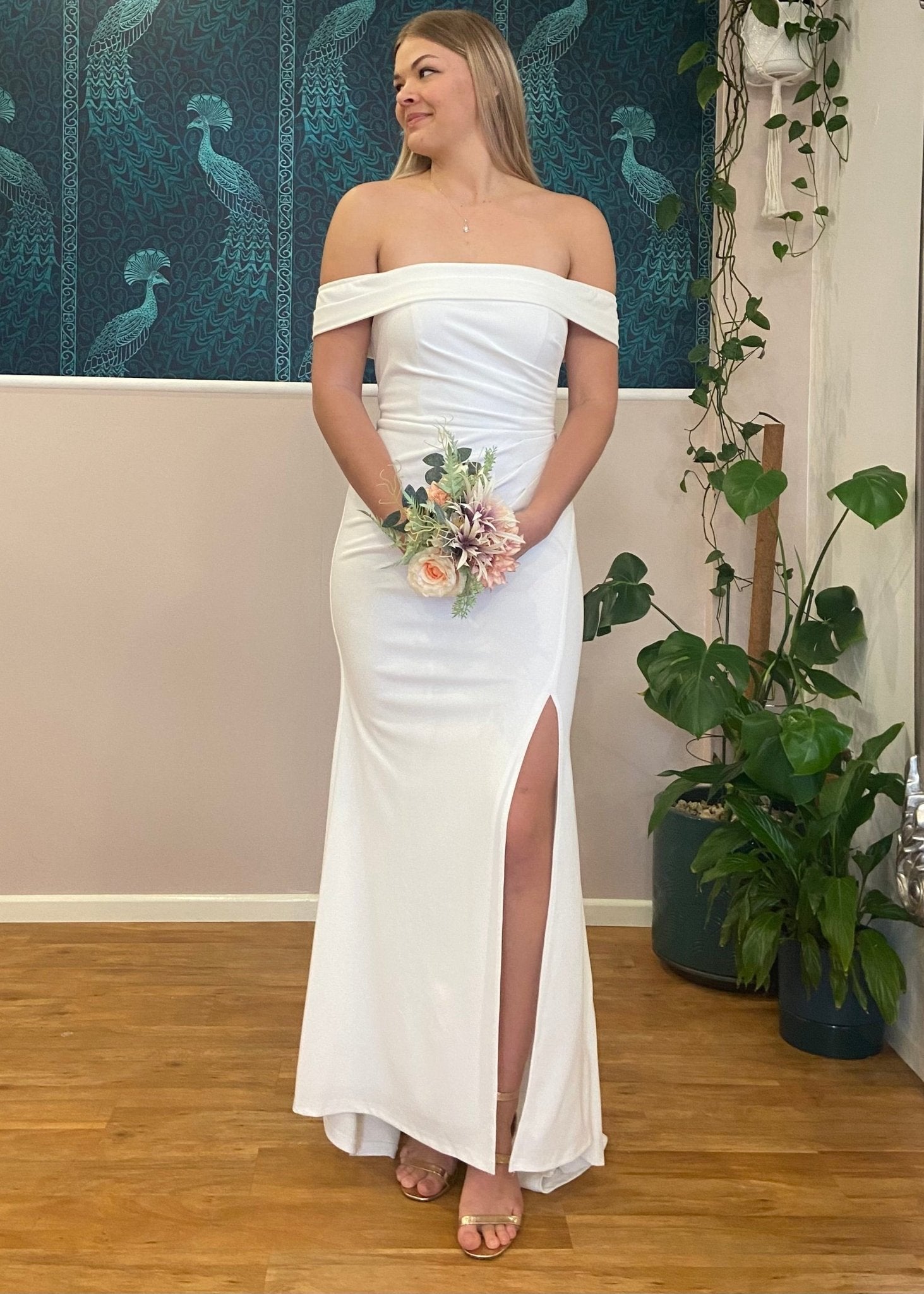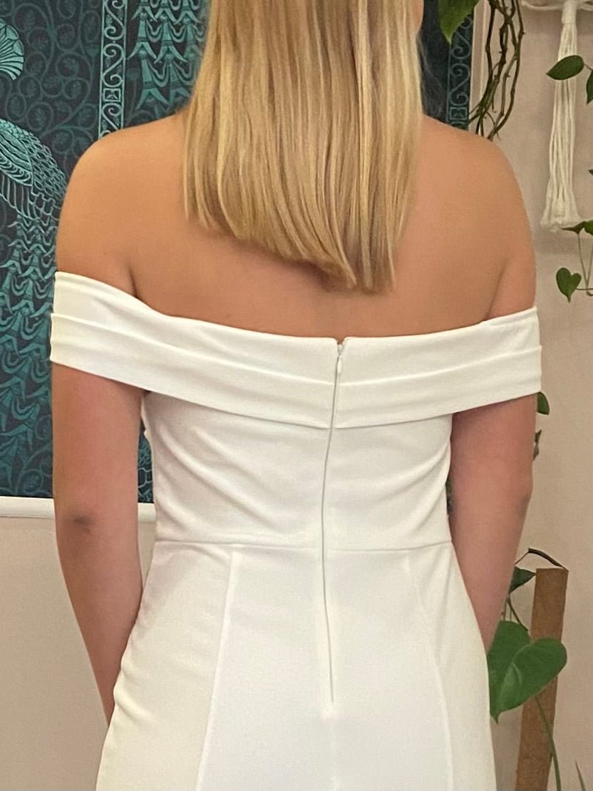 What an exquisite ivory wedding dress. With a beautiful off shoulder bodice. This gown features a split and a rushed side for a gorgeous body hugging fit which flatters. This dress is sleeveless and has a concealed zip at the back.  The gown is padded in the bust, is lined and has a fishtail train. A fabulous gown to feel beautiful for your big day.