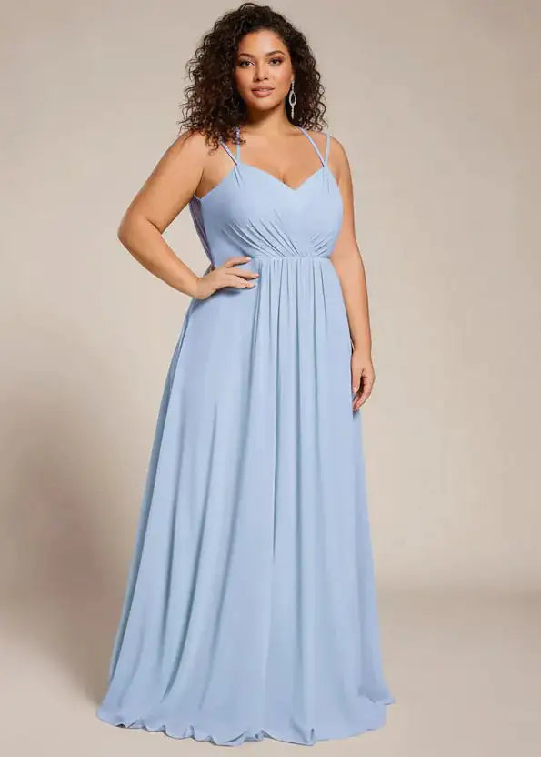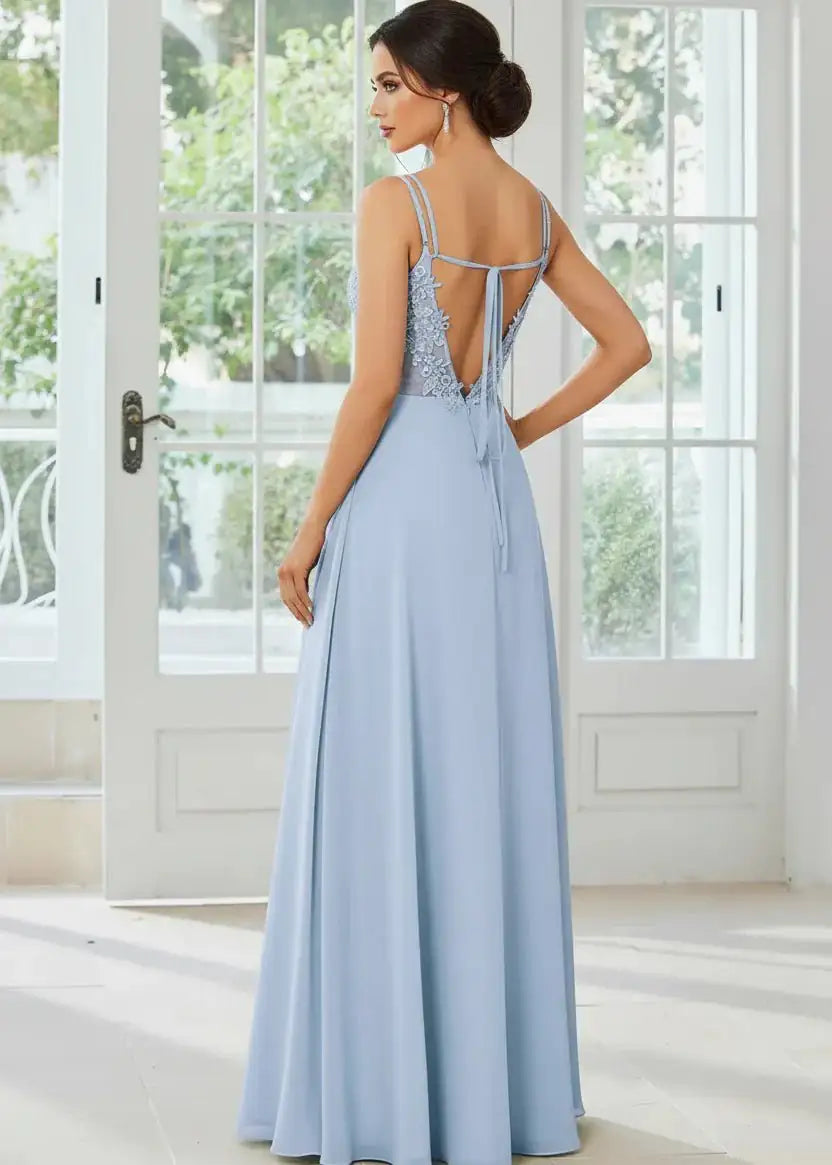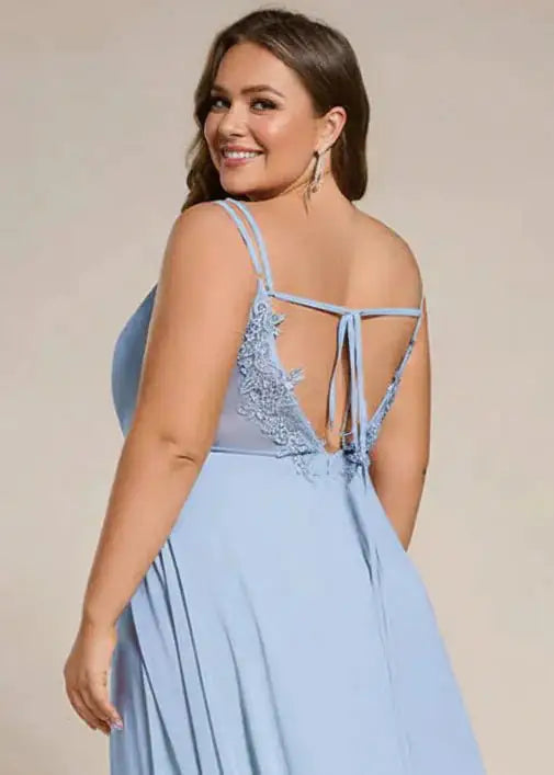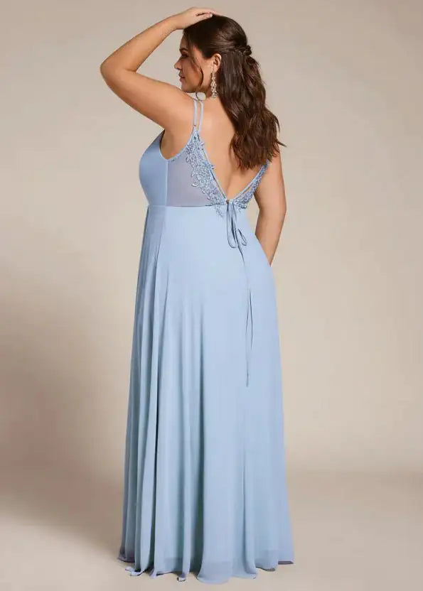 Beautiful bridesmaid dress with an illusion back with lace appliquéing. The lace up straps can be tied a number of ways. The front is super flattering as it has pleating at the waist which flows softly over your tummy, hiding any bumps. This gown is padded in the bust and zips up at the back as well as having the tie-ups. It is also lined. A really beautiful option for bridesmaid and also loved as a ball dress.