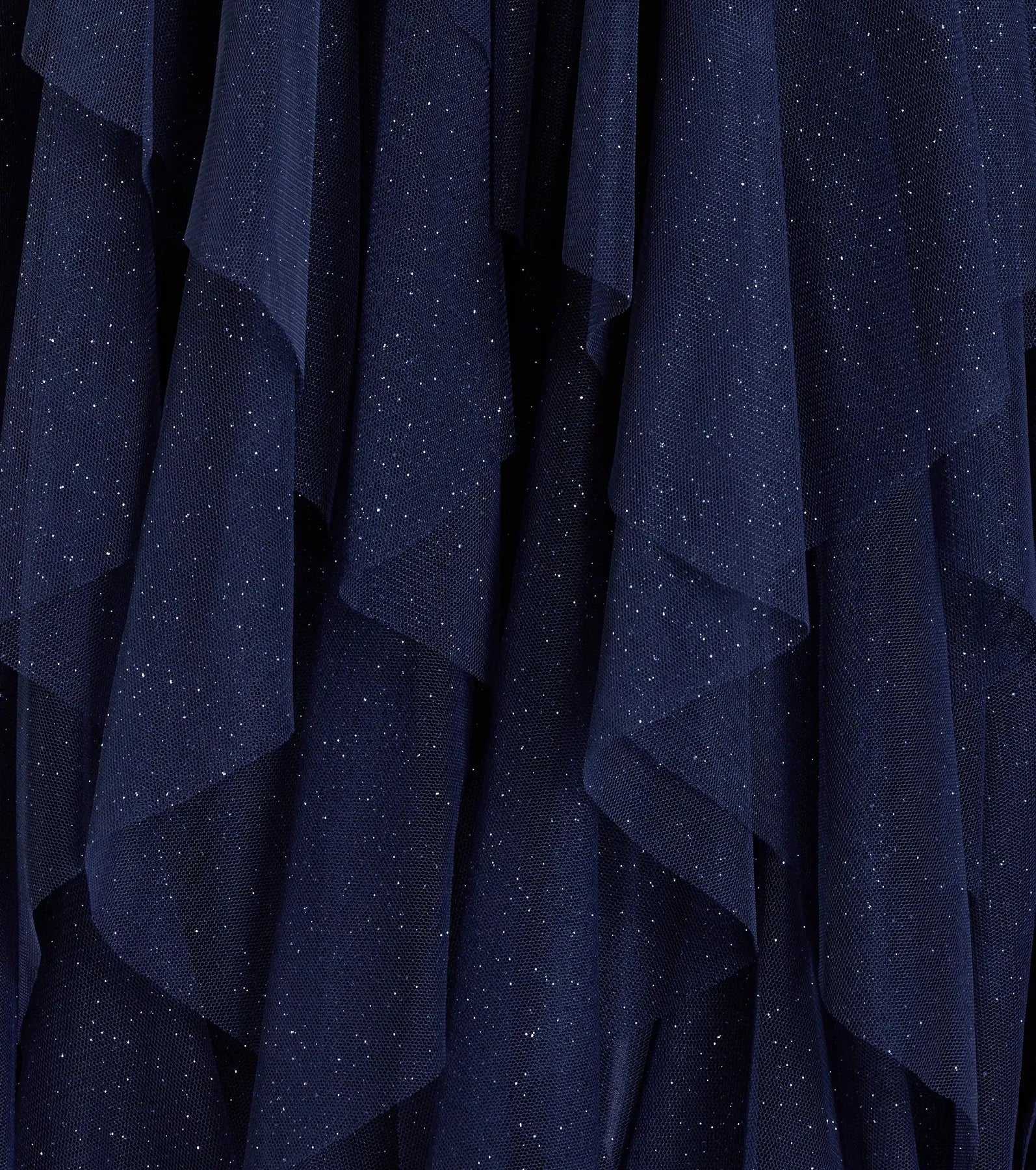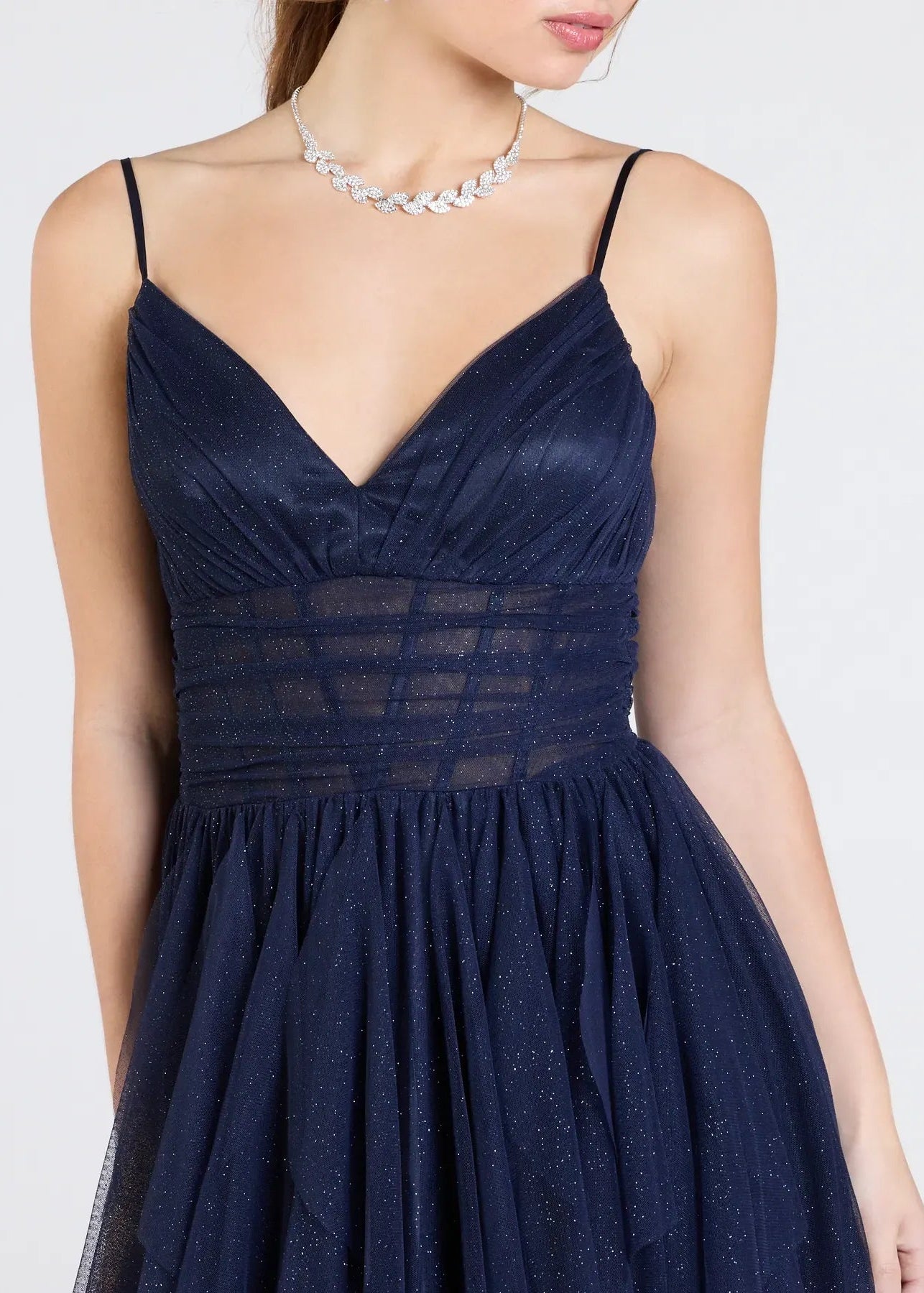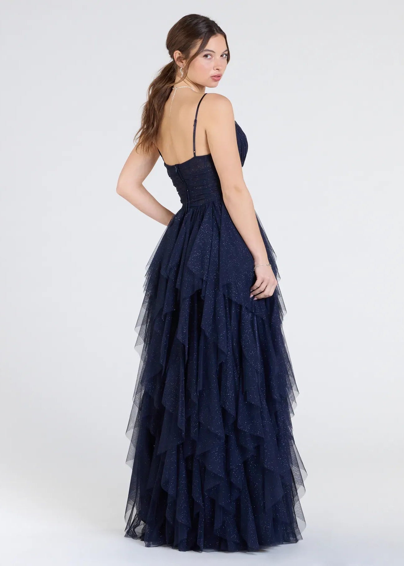Beth Corset Ruffled Ball Dress. This navy stunner features a sheer corset bodice with flexible boning and an enchanting ruffled A-line skirt that flows to the floor with glamorous glitter mesh detailing. The V-neckline and adjustable spaghetti straps offer a flattering fit, while the back zipper closure ensures easy wear. Perfect for a school ball, black-tie celebrations and Special Occasion work events.