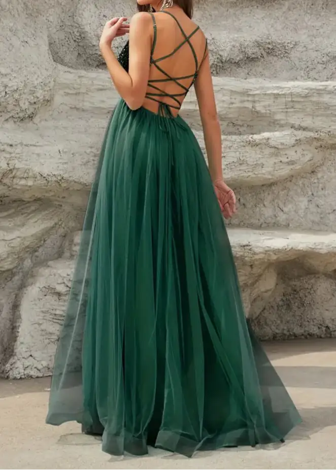 Constance strappy back forest green ball dress