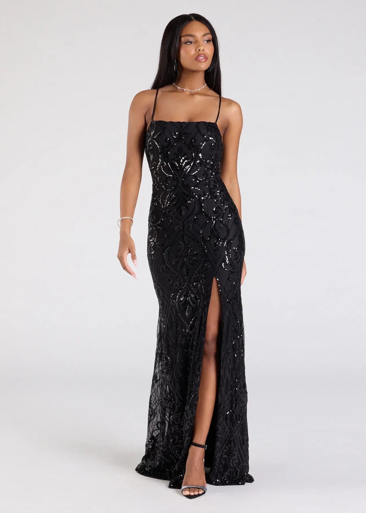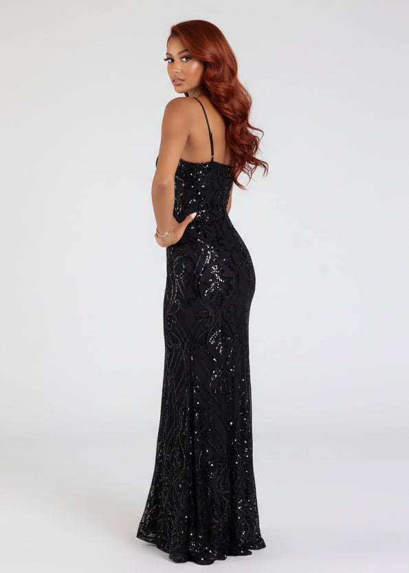 Corina captivates in black sequin elegance. This stunning ball dress features an intricate sequin scroll pattern that catches the light beautifully, paired with a flattering square neckline and curve-hugging silhouette. The high front slit allows graceful movement, while the floor-length hem delivers timeless sophistication. Perfect for formal events, galas, and unforgettable evenings where you want to shine.