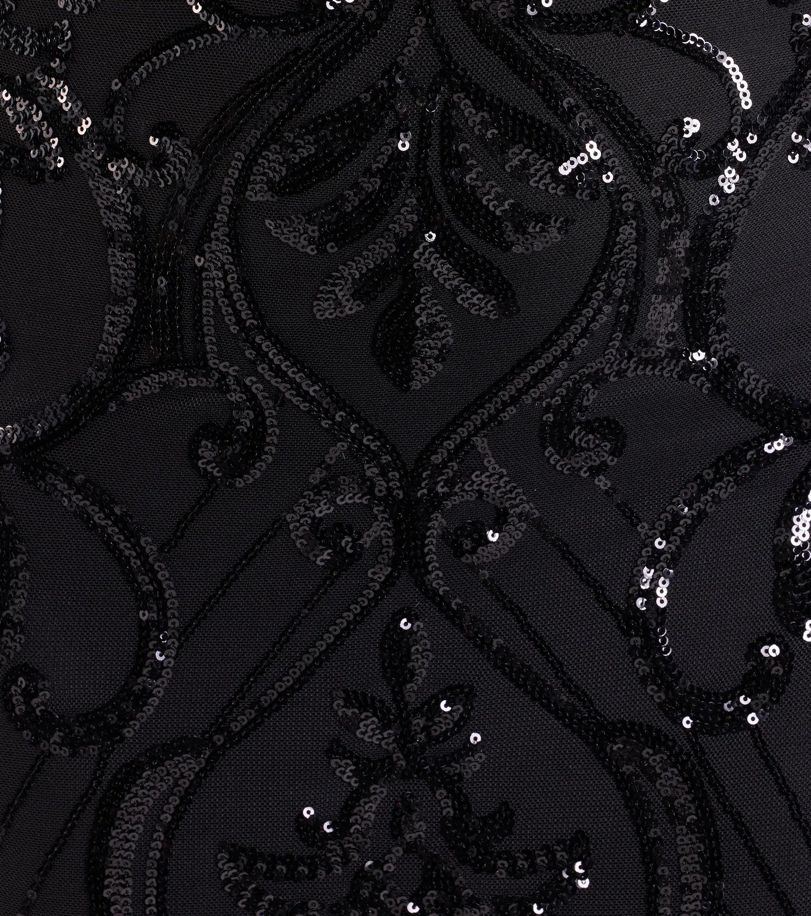 - Sequin scroll pattern, mesh fabric, full knit stretchy lining