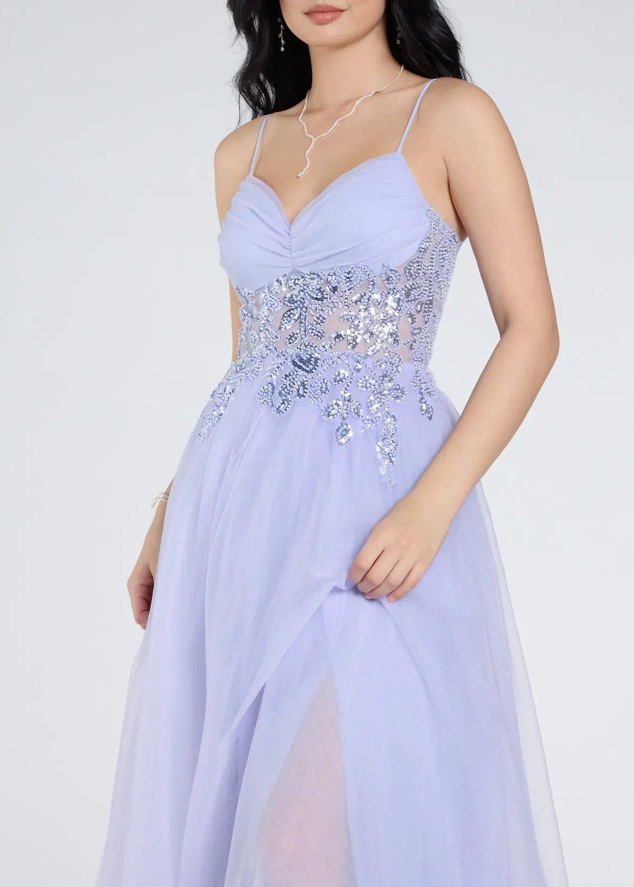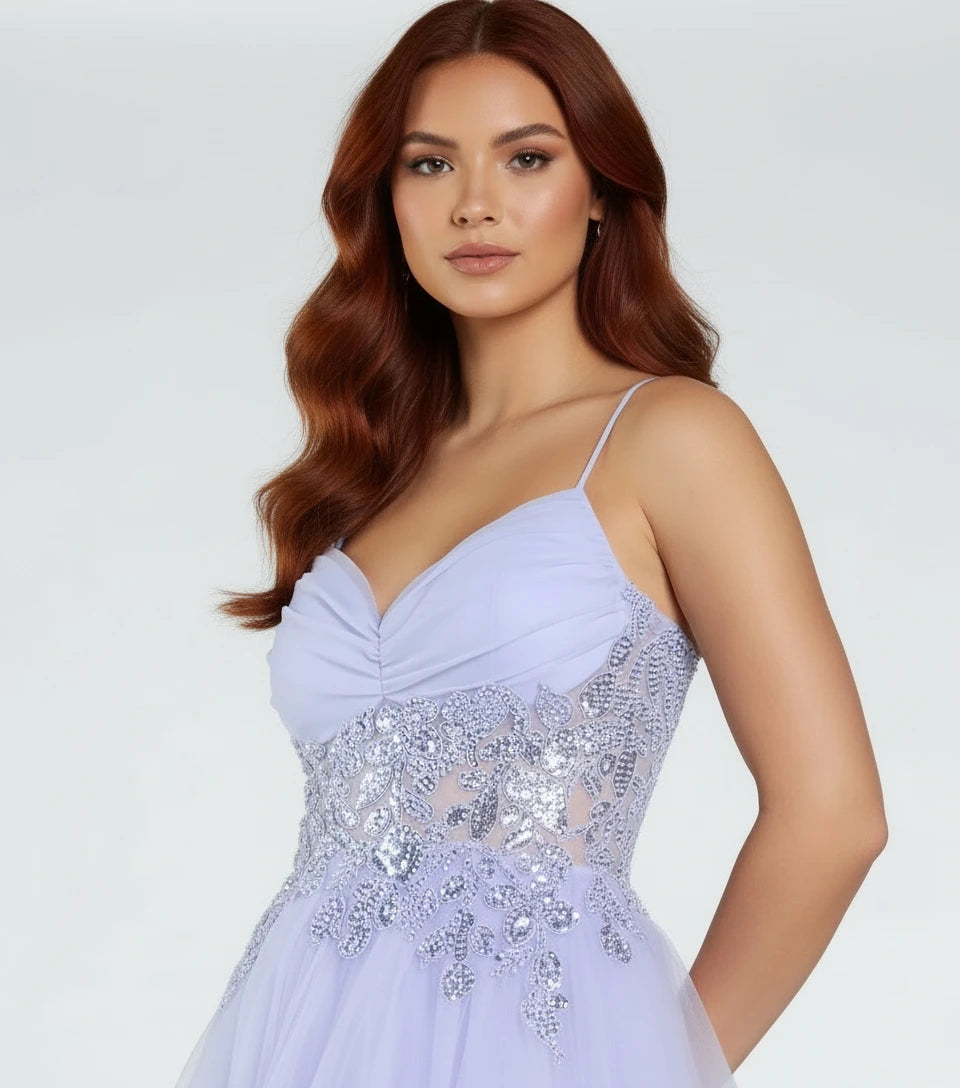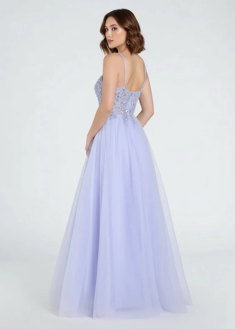 Meet our Kaitlyn Princess Party Ball Dress, an A-line design to make you feel like royalty. The airy tulle fabric creates a princess silhouette, while the sheer bodice showcases a stunning sequin appliquéing that catches the light beautifully. A V-neckline with padded bra cups provides comfortable support, and adjustable spaghetti straps keep everything in place. The high slit offers graceful movement, while the back zipper and hook-eye closure ensure a polished look. Lined with tulle and stretchy knit for comfort, this floor-length gown is perfect for those magical moments when you want to shine.