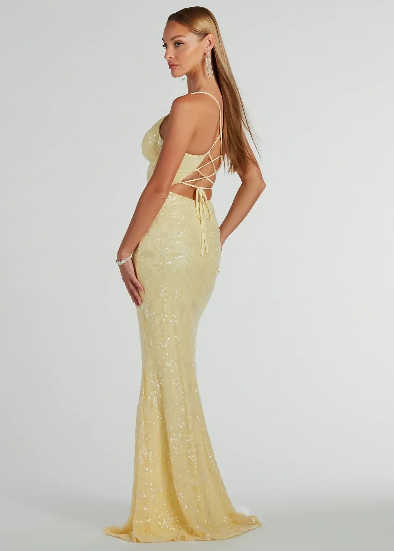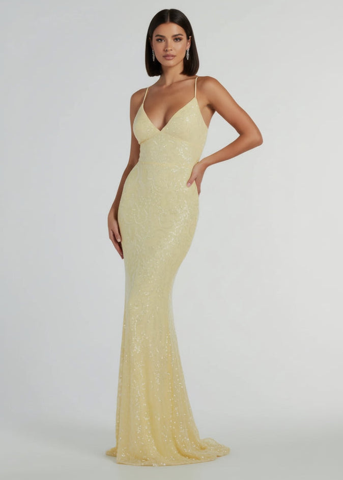 This stunning pastel yellow formal dress features an eye-catching sequin design that shimmers with every movement. The elegant lace-up back detail adds a touch of sophistication, while the flattering mermaid silhouette and flowing floor-length hem create a show-stopping look perfect for any formal occasion.