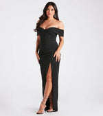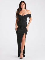 Marlene off-shoulder corset dress—This sophisticated creation features an alluring sweetheart neckline with short-sleeve cuffs and integrated padded bust for impeccable structure. The corset bodice, enhanced with boning, sculpts a captivating hourglass silhouette, while the high-waisted ruching adds dimensional texture. The sleek floor-length profile, crafted from crepe with a smooth stretch lining, embraces your shape. Also a tasteful front slit perfect for distinguished social engagements.