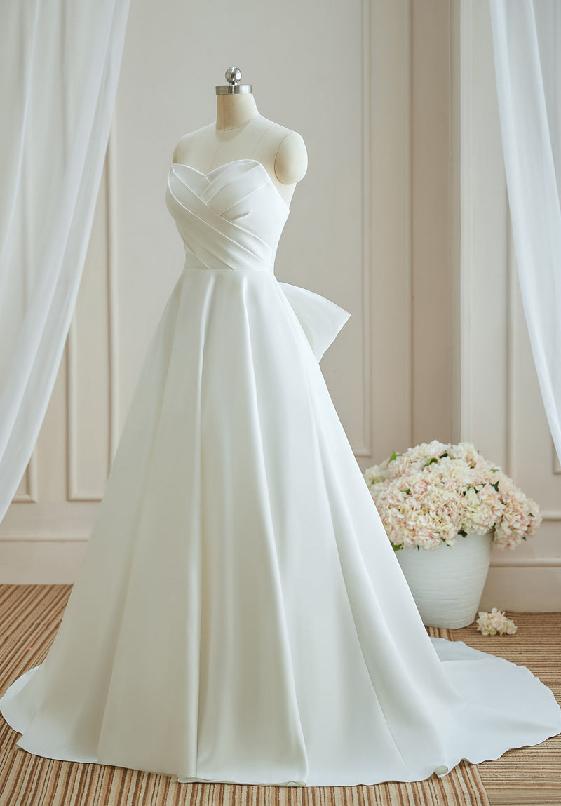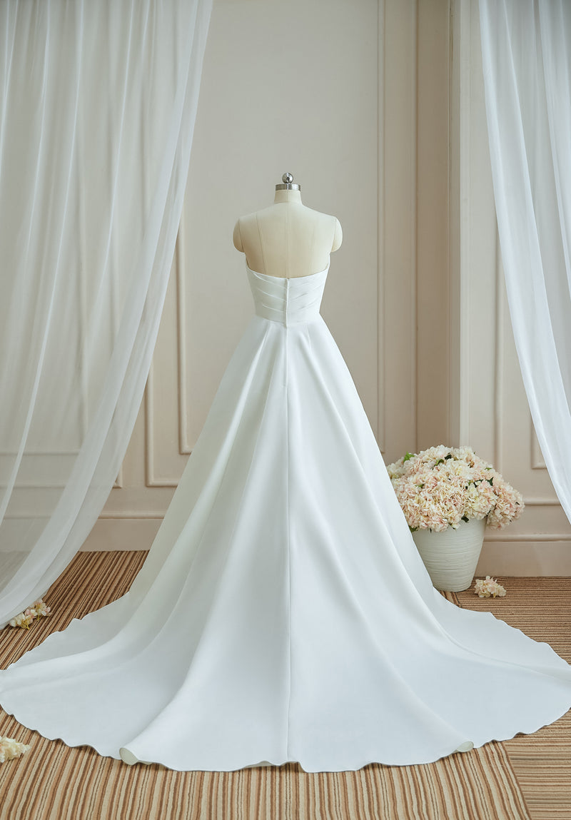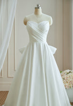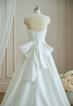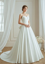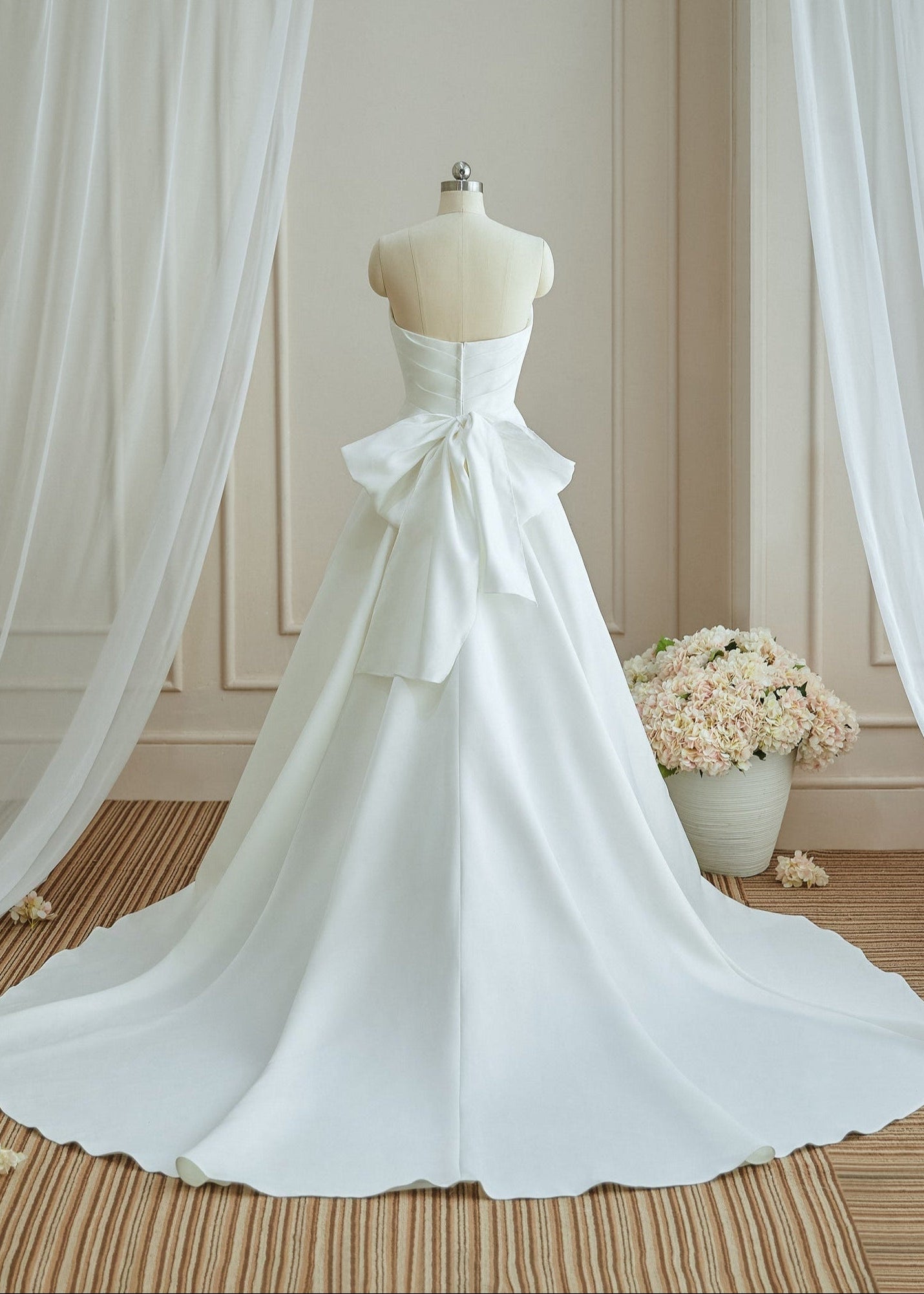 Elevate your special day with our Melinda Ivory wedding gown. The ball-gown silhouette features a pleated bodice and detachable bow, adding a touch of elegance. Made with Magnolia Satin and expert craftsmanship, this dress is beautifully designed with a concealed back zip for easy closure.