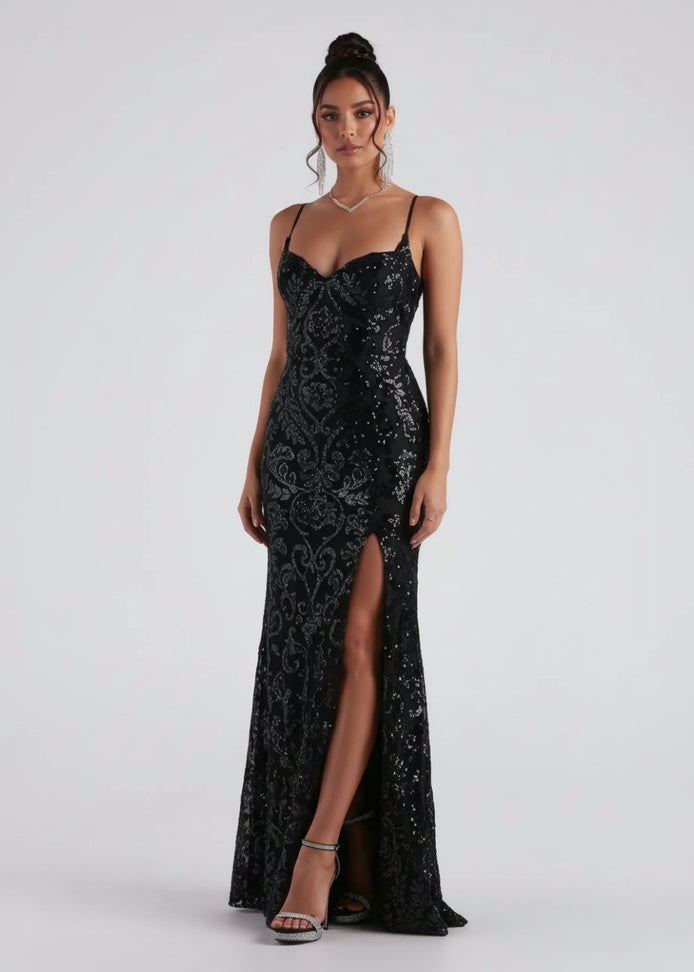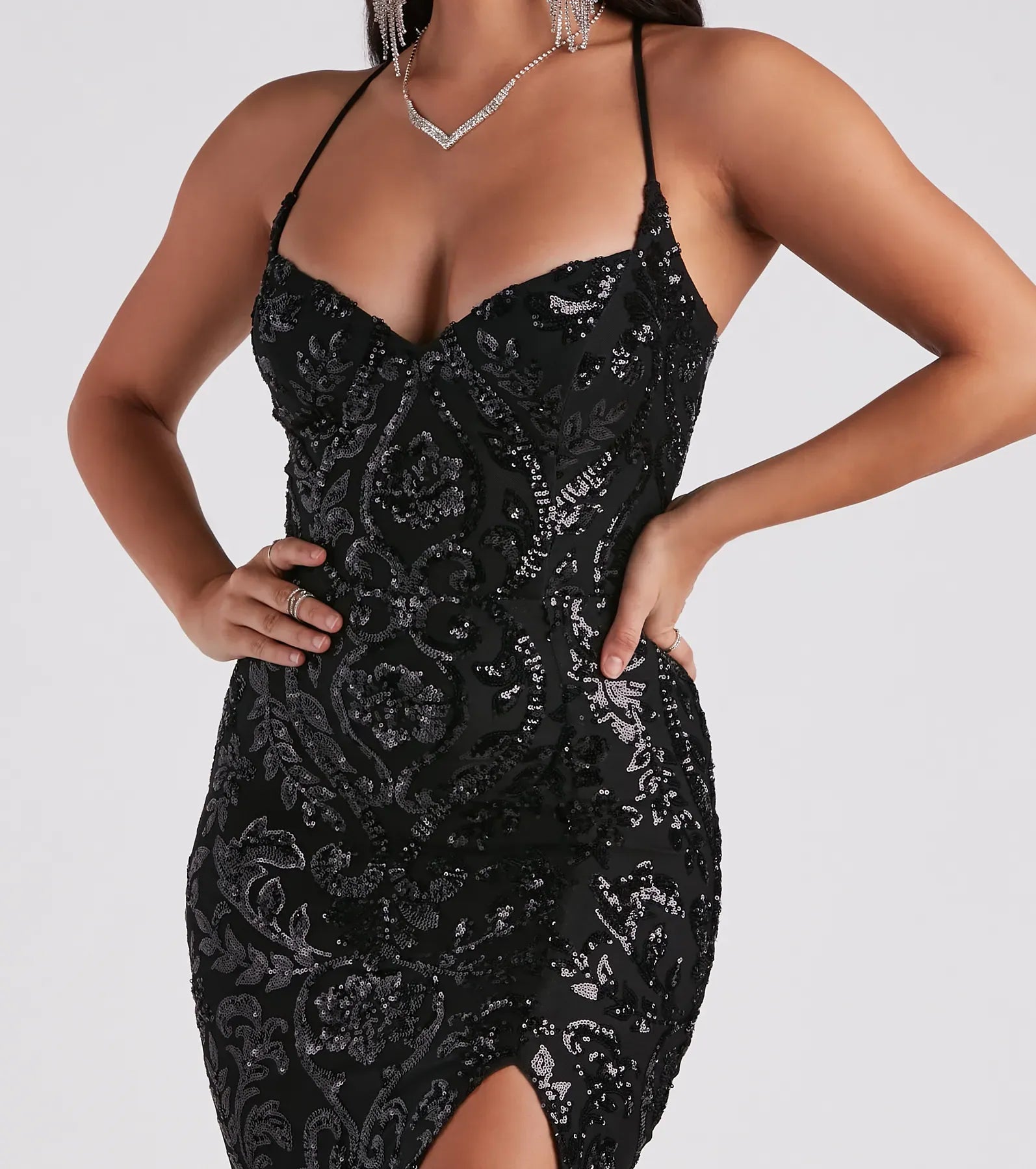 A sequin scroll pattern brings elegant sparkle to the Nila formal evening dress! She features a curve-flaunting silhouette designed with an alluring high front slit for movement and a floor-length hem for a sophisticated finish.