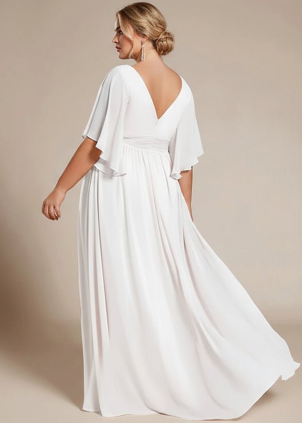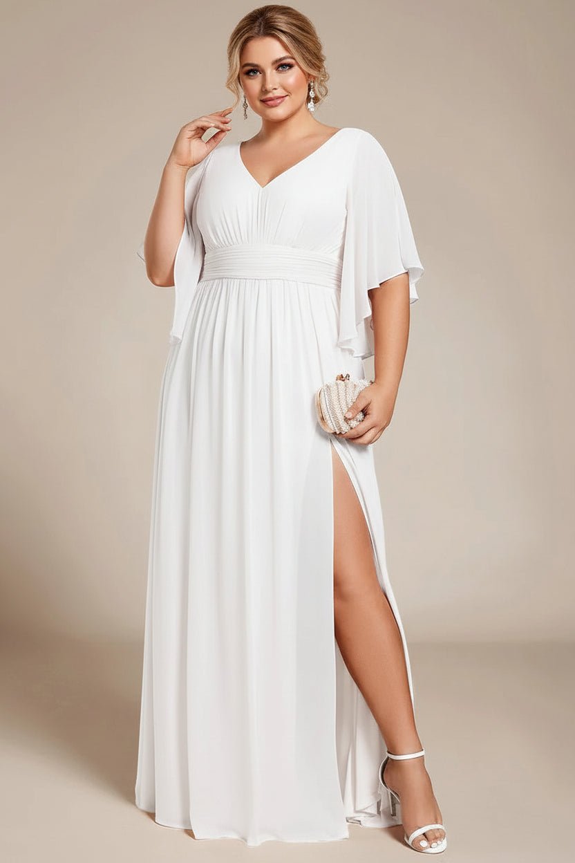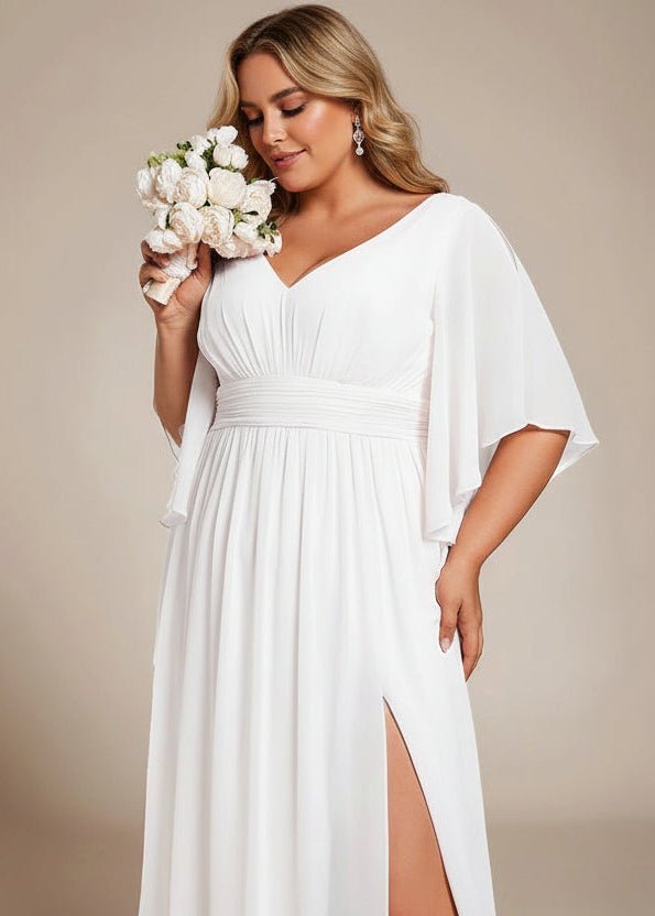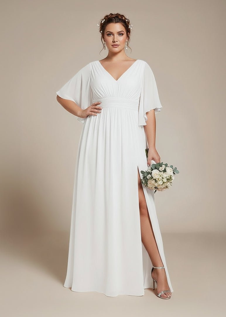 Looking for a white sleeved chiffon wedding dress? Discover effortless elegance in this stunning white sleeved chiffon wedding dress. Featuring graceful draped sleeves and a flattering V-neckline, the design flows beautifully with soft pleating and a defined waist. The fully lined bodice is bra-friendly with no padding, while strategic gathering at the waist creates a smooth, flattering silhouette. A subtle slit adds movement and sophistication to this comfortable, easy-wearing gown that lets you feel confident and beautiful on your special day.