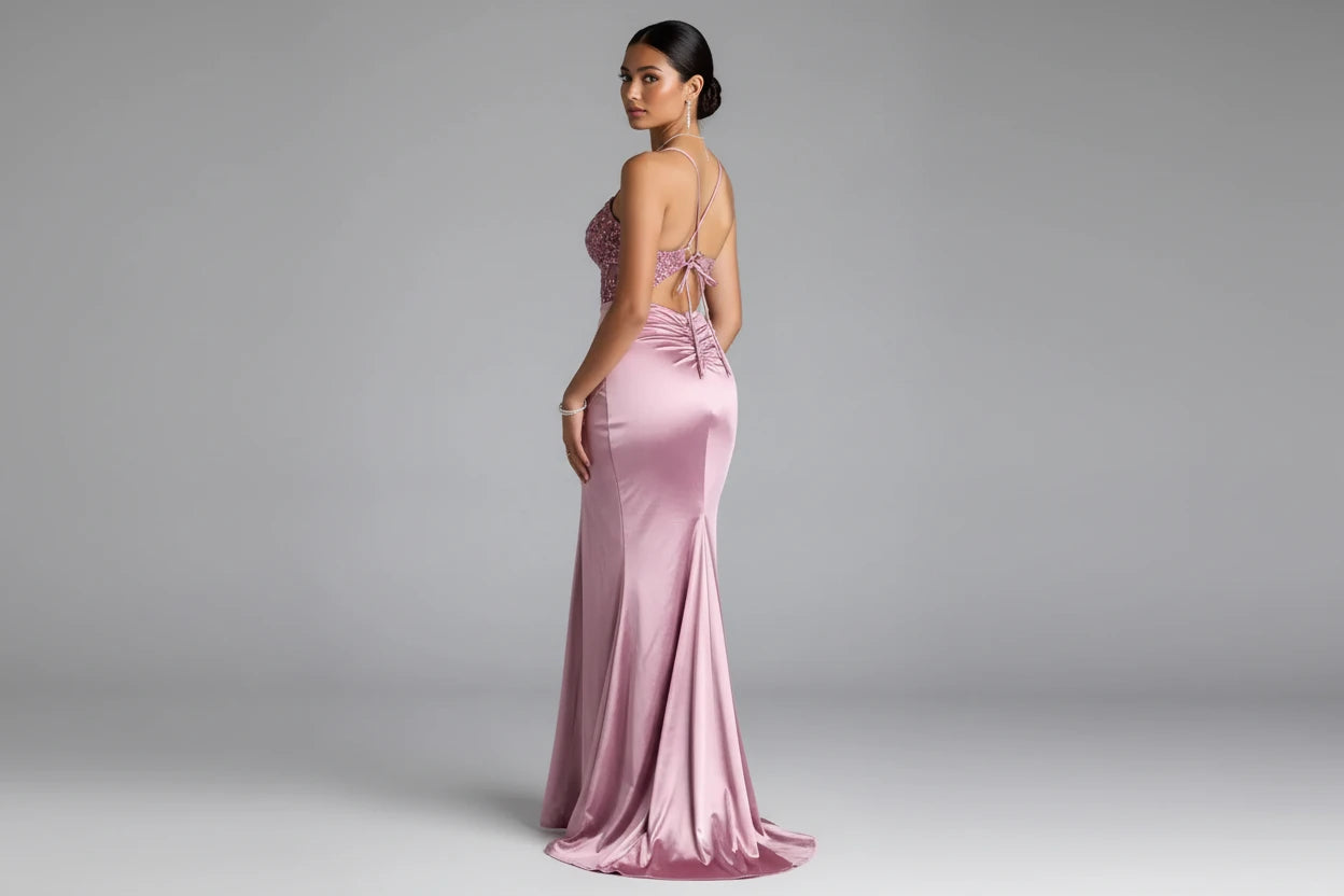 Meet the Stephanie Corset Satin Ball Dress in dusty pink. This stunning gown features a V neckline with delicate spaghetti straps and a show-stopping strappy lace-up back that adds intrigue and elegance. The appliqué-embellished bodice pairs beautifully with a figure-flattering mermaid silhouette that hugs your curves in all the right places. In a luxurious stretch satin, this floor-length dress includes a high front slit for movement and comfort. Perfect for school balls, black-tie events, special occasions, and red-carpet moments.