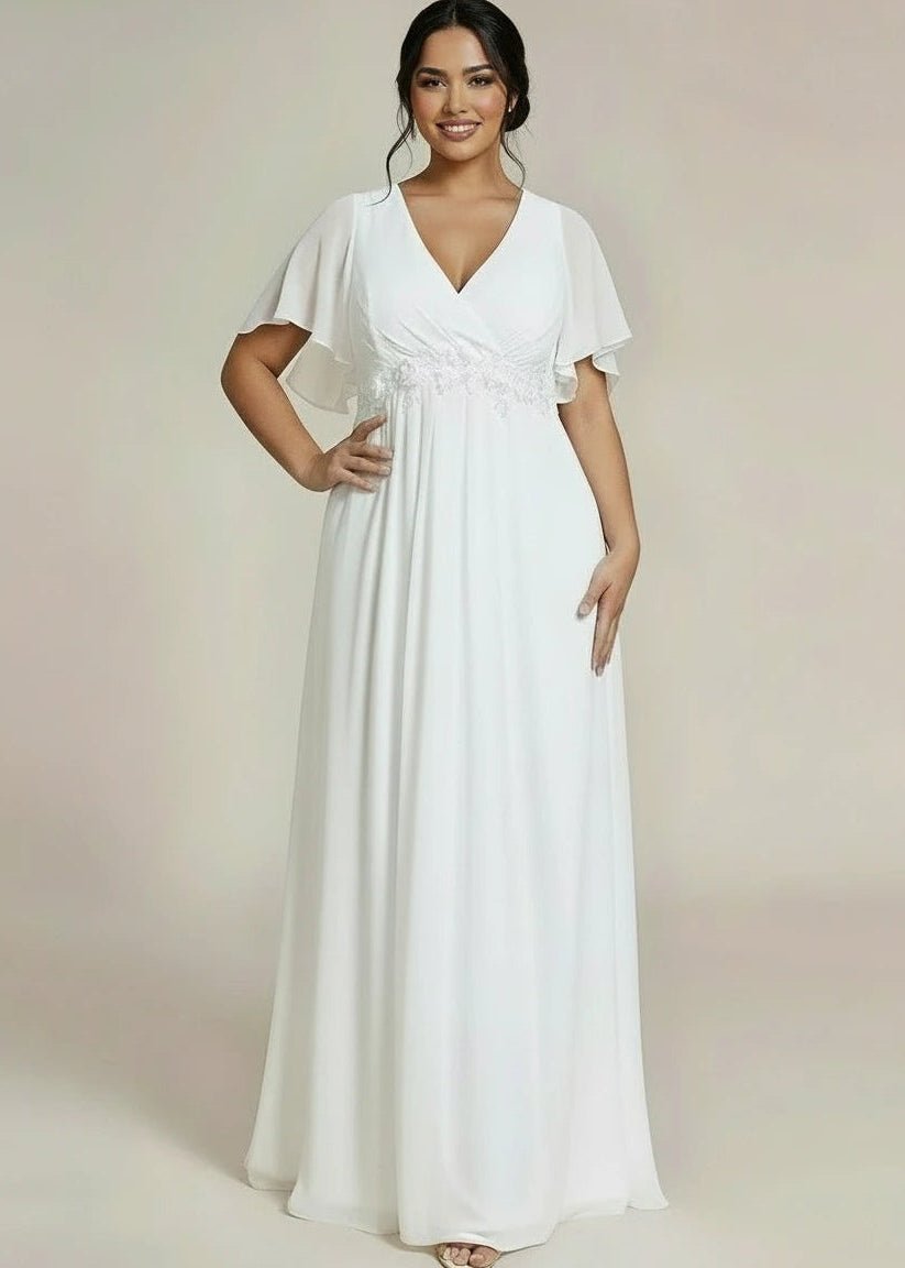 Such a great option for your wedding dress, covering regular and plus sizes. Appliquéing with non-contrasting sequins adorns the under bust for something a bit special. This gown has it all, from a flutter sleeve for coverage. A V-neck to suit most body shapes and flattering pleated flowing fabric extending from under the bust to hide any lumps and bumps.  This gown does up at the back and gives back coverage too. The gown is lined and does not have bust padding.  Perfect for wearing with a bra, so it is a great option for larger busts.